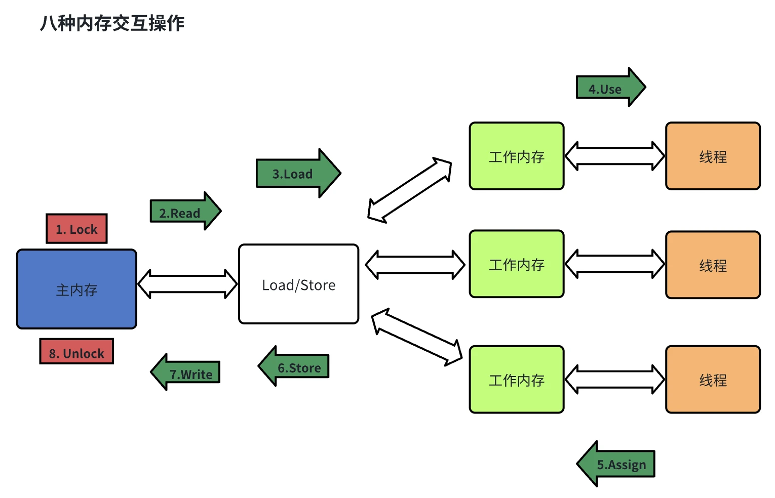 5. 为了更精准控制工作内存和主内存间的交互,JMM 还定义了八种操作:lock, unlock, read, load, use, assign, store, write。