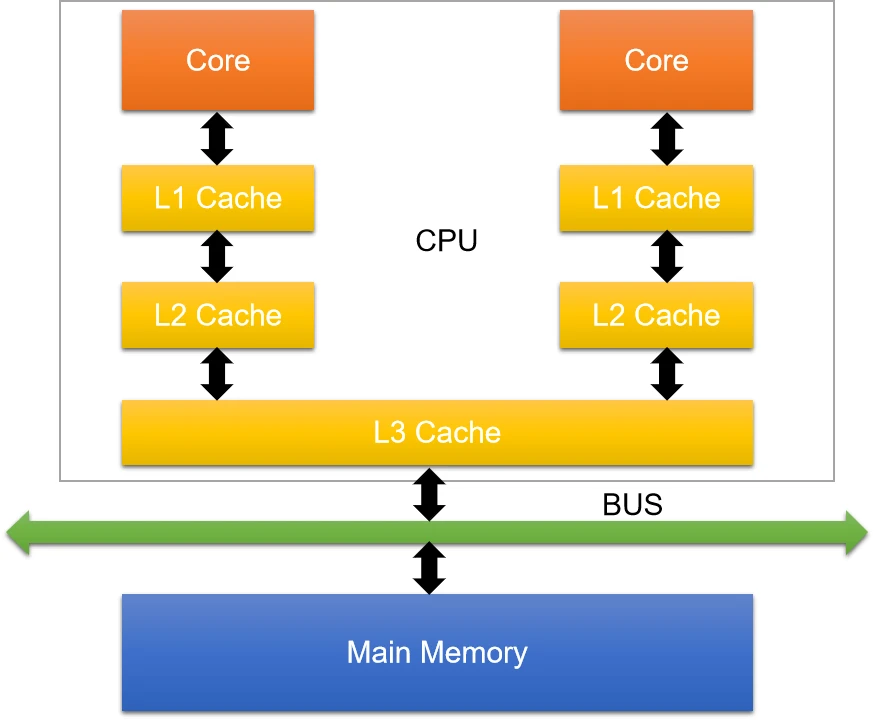 在多CPU的系统中(或者单CPU多核的系统),每个CPU内核都有自己的高速缓存,它们共享同一主内存(Main Memory)。每个CPU都有着自己独立的缓存,它们各自之间是不可见的,这就会导致对应CPU读取的数据都是自己缓存的,无法看到别人对共享数据的修改,从而导致并发BUG。
