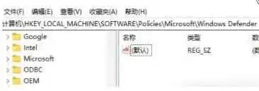 2、打开注册表定位到“HKEY_LOCAL_MACHINESOFTWAREPoliciesMicrosoftWindows Defender”这个位置。