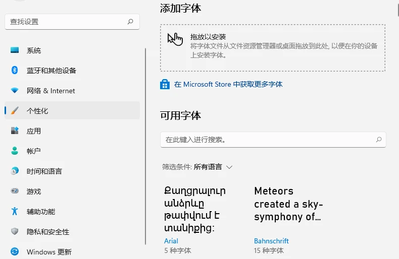 3、个性化 - 字体下,就可以添加字体了(拖放以安装,将字体文件从文件资源管理器或桌面拖放到此处,以便在你的设备上安装字体)。