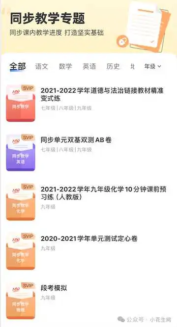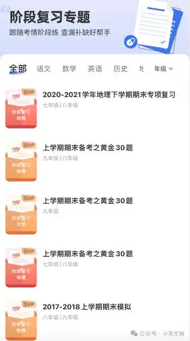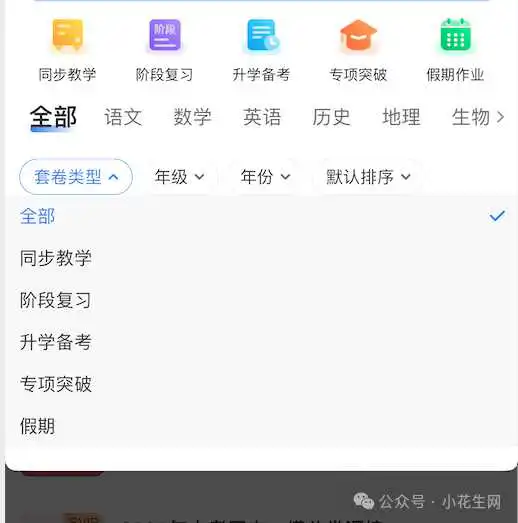 为了满足孩子日常的测试需求,小白试卷宝还将试卷进行了详细分类,包含了5大类试卷,同步教学、阶段复习、升学备考、专项突破、假期。