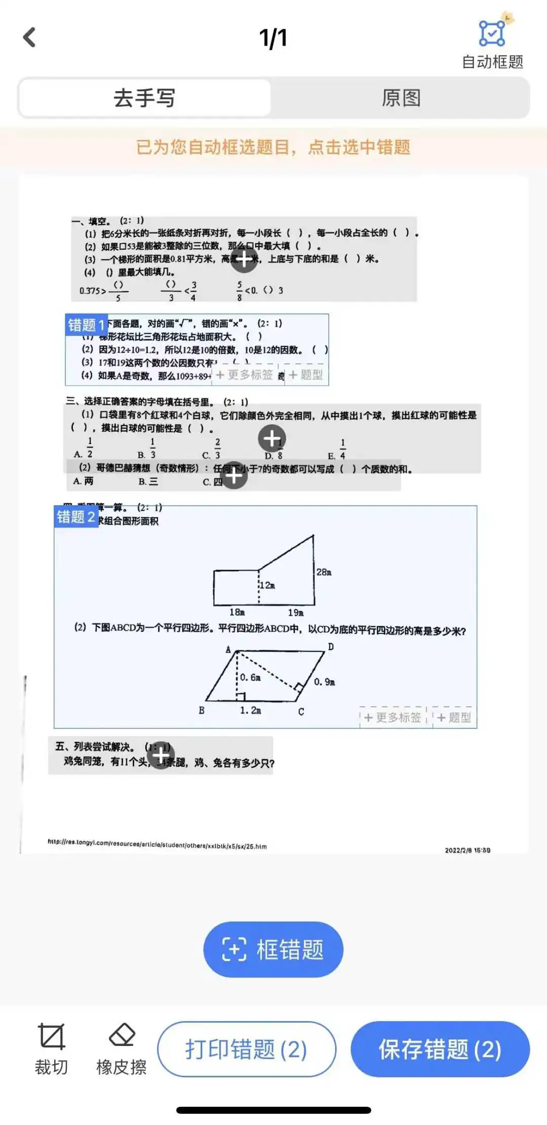 支持AI拍照录入错题,自动去除答题痕迹,一键框选,自由调整