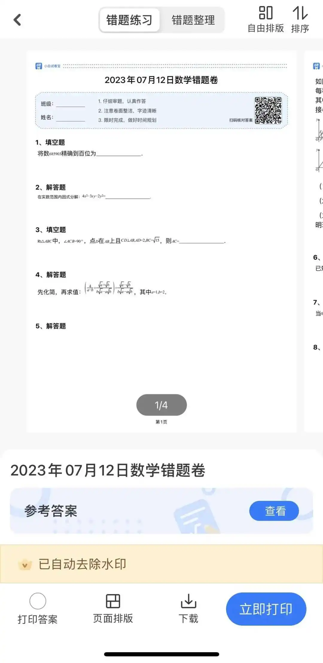 做完后,系统会自动把错题加入错题本中,还会把这些错题整理成一张卷子,让娃针对性练习。