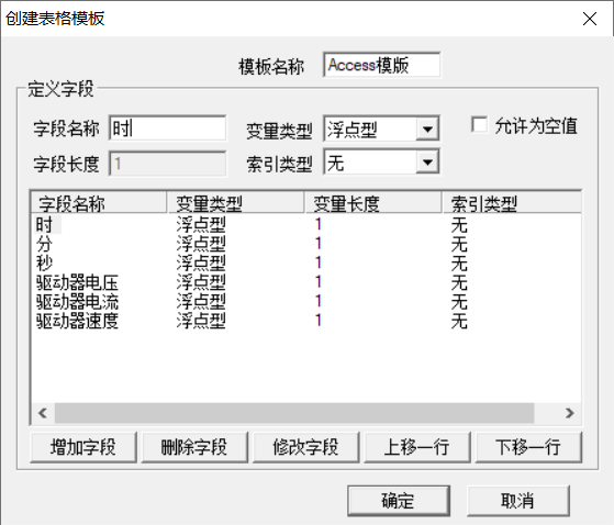 新建表格模版,表格模版为后面在数据库文件中建立数据库表格时候需要使用,如下图所示,在新建的表格模版中建立一个名为“Access模版”的表格模版,如图所示的6个字段,为每个字段匹配好对应的变量类型。