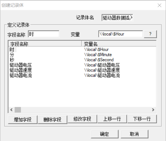 建立完表格模版后,需要定义记录体,记录体定义是按表格模版的方式建立,并需要给定义的字段关联对用的变量,新建一个名称为“驱动器数据插入”的记录体,并在该记录体中定义如下图所示的内容。
