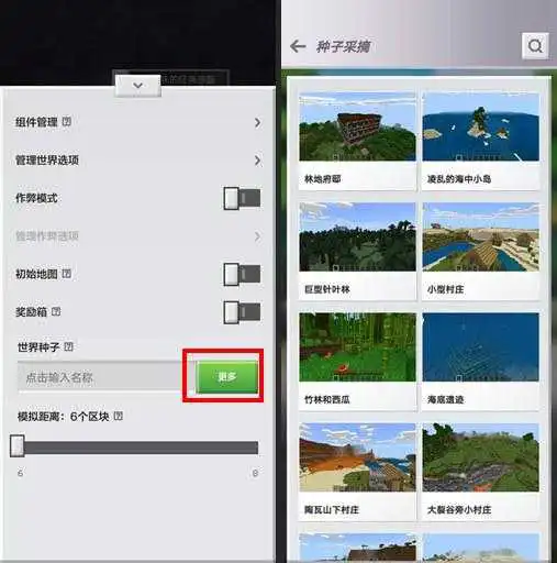 除了以上三个什方收藏的地图种子外,官方游戏内其实也为我们冒险家准备了各式各样种类的种子,我们只要点击在种子选项旁边的“更多”,就能选择最新的世界种子啦!