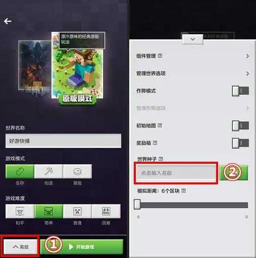 在分享种子之前什方先为小白玩家们解释下种子的使用方法:在创建冒险世界时,点击下方的高级,下拉到种子选项,输入地图种子,然后点击开始游戏即可~
