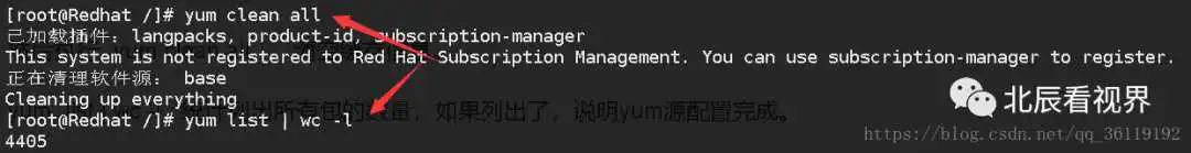 yum list | wc -l 统计列出所有包的数量,如果列出了,说明yum源配置完成。这里可以看出有4405个包。