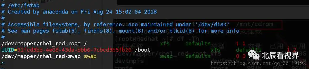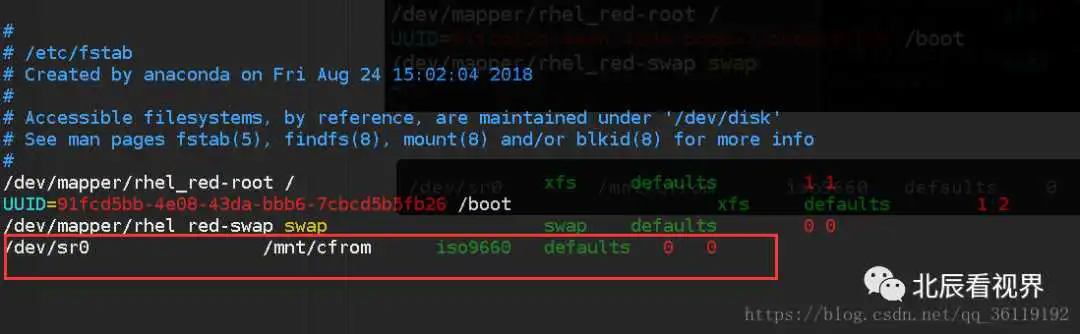 我们的设备的挂载信息在 /etc/fstab 里面,所以我们要想永久挂载,需要修改 fstab 文件。用 vim 打开该文件,我们可以看到有三行信息,是其他分区的挂载信息,所以我们现在要把我们的光盘的挂载信息添加过去。