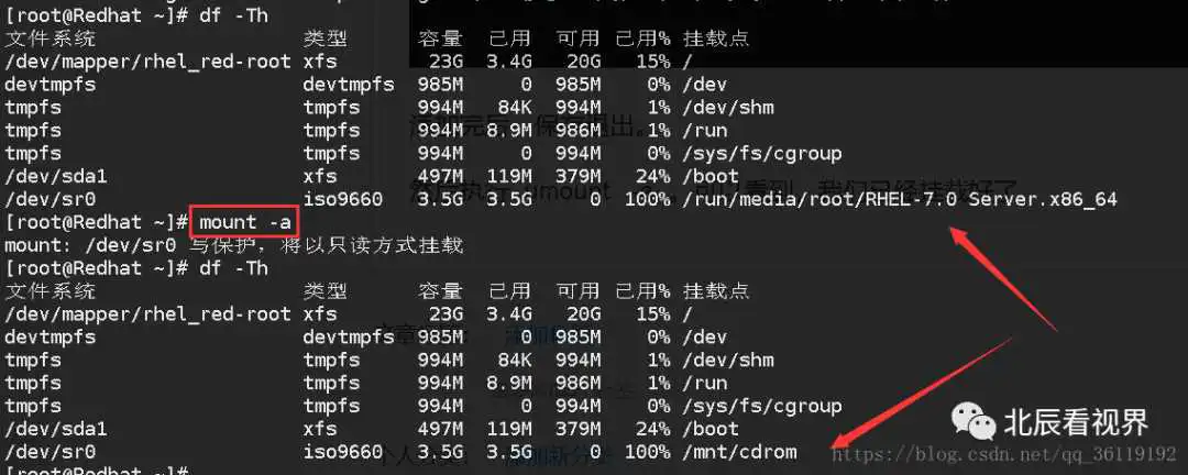 然后执行 mount -a 。这个命令的意思是挂载fstab文件中的所有文件系统。可以看到,我们已经挂载好了。