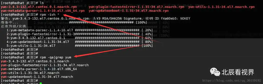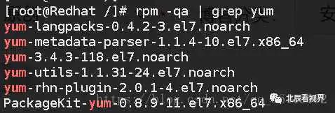 首先查看redhat7系统本身安装的yum软件包 ,redhat本身安装了6个关于yum的软件包,我们需要把它给卸载!