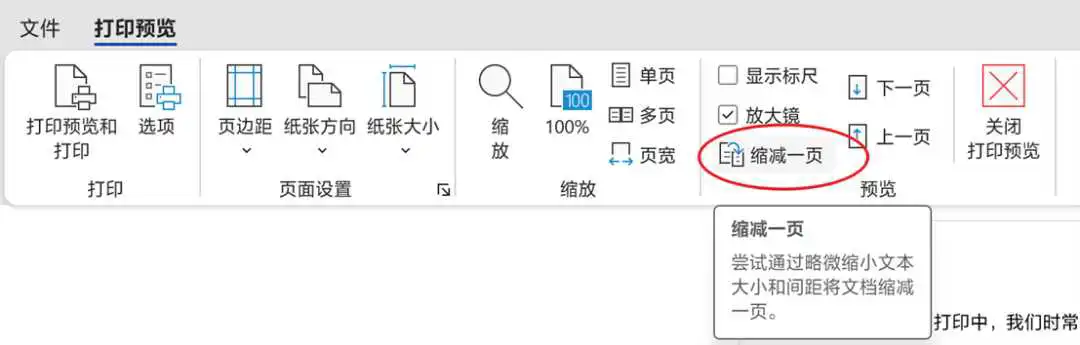 在文档打印中,我们时常遇到第二张纸中仅有一两行文字的情况,不仅浪费纸张,还会影响阅读体验。这时我们可以通过设置一页纸打印,让打印机自动调整。在功能区的搜索文本框内直接输入“打印”(或运用“Ctrl+P”)二字,选择“预览和打印”→“打印预览编辑模式”,在打印预览编辑模式中,单击“缩减一页”命令即可。