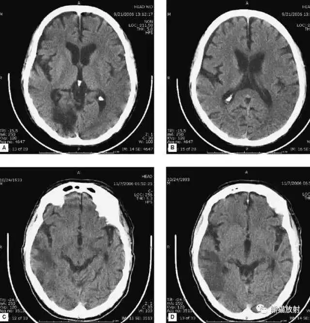 C、D:亚急性期脑梗死,低密度,无明显占位效应。