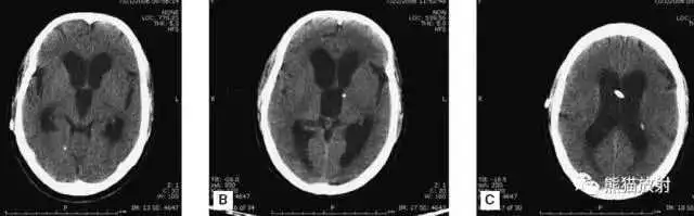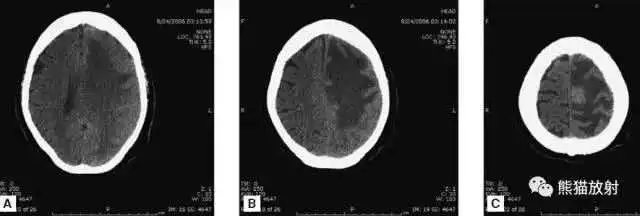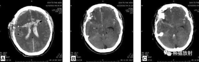 颅脑CT常用的三个窗(图A-C):