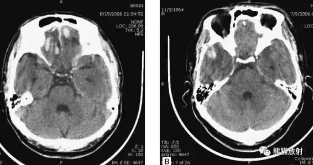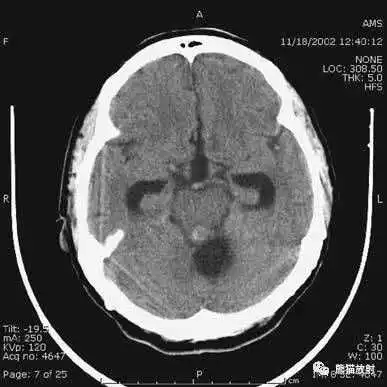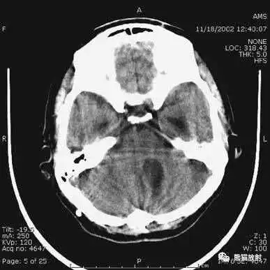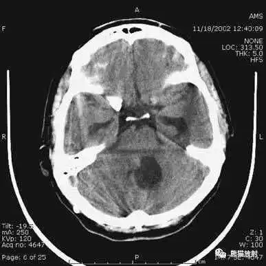 层厚较大时,可导致血液密度表现,在脑基底部较典型,易发生在眼眶上方额叶。
