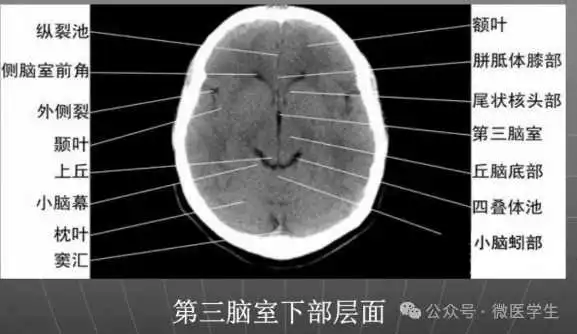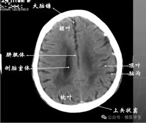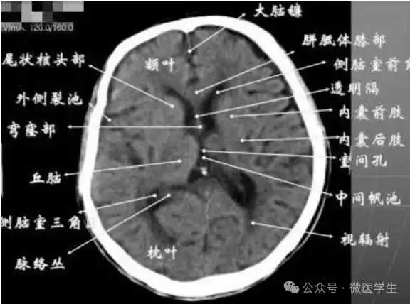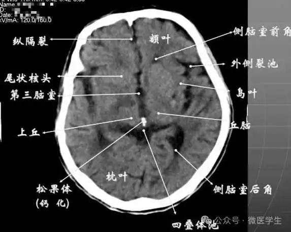 由额、颞、枕叶构成,两侧侧脑室体部之间为透明隔,外侧为尾状核和体部。侧脑室后角(枕角)可不对称,室内可见脉络丛钙化。中线处可见大脑纵裂池和大脑镰。
