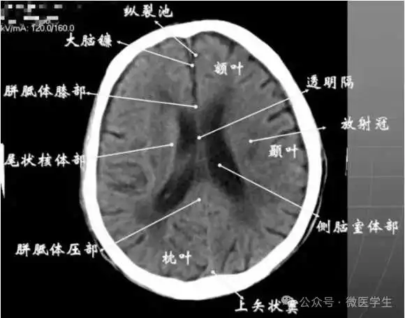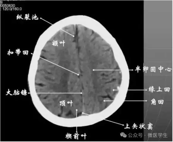- 半卵圆中心:位于胼胝体上方,由左右大脑半球髓质形成的有髓纤维,对称位于大脑镰两侧区域。