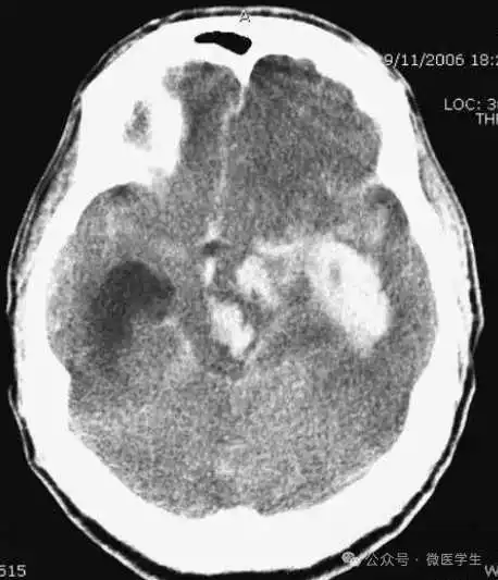 脑出血并周围水肿,可随时间扩大,