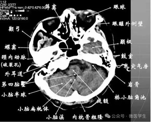 - 颅前窝底部:眼眶,眼球,筛窦,蝶窦,前床突等。