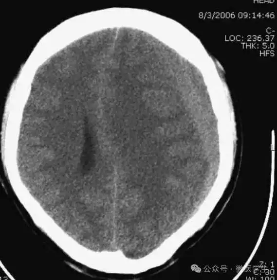 右侧硬膜下血肿(急性-高密度,慢性-低密度);右侧大脑水肿,中线结构移位