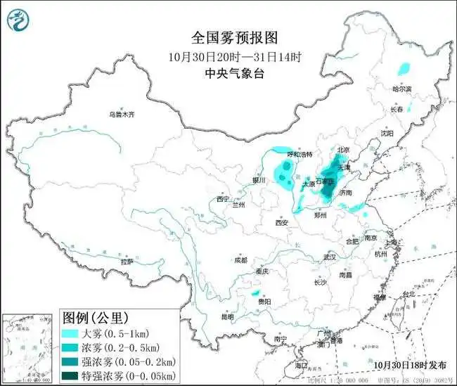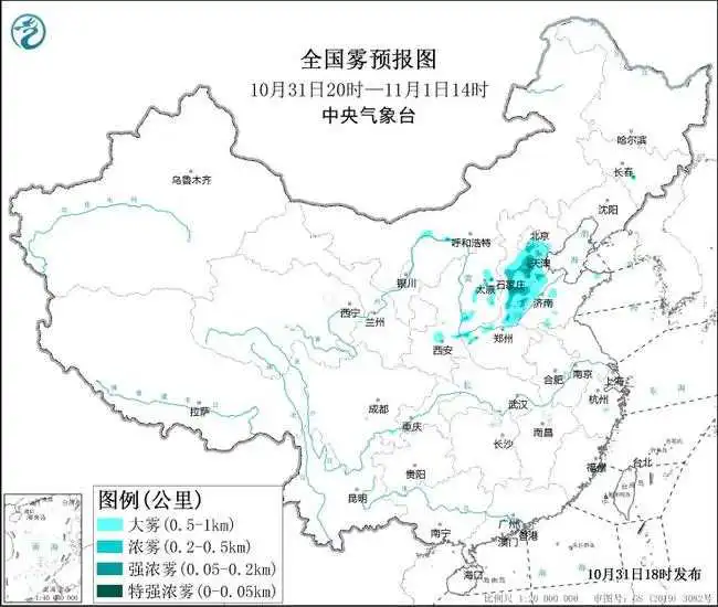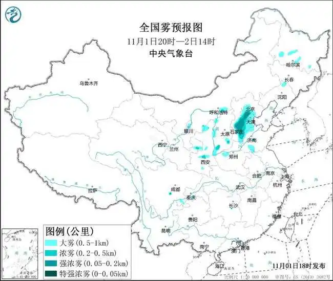 中央气象台11月1日18时继续发布大雾黄色预警。