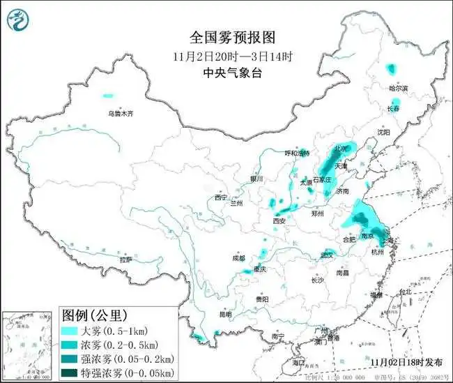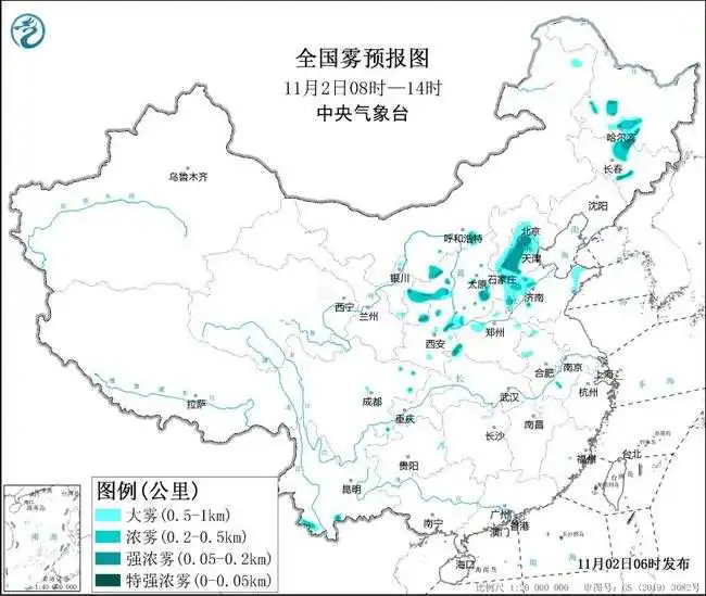 11月2日早晨至上午,北京、天津、河北中南部、山东西部、山西中南部、陕西中北部、黑龙江南部、吉林中部等地有大雾天气。