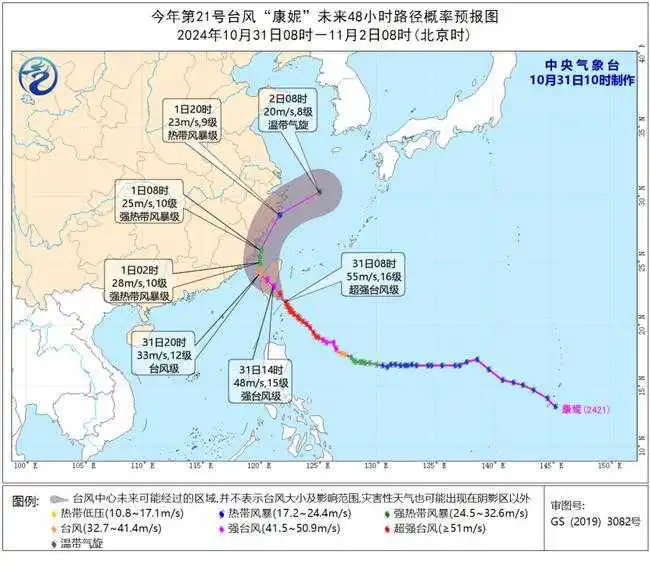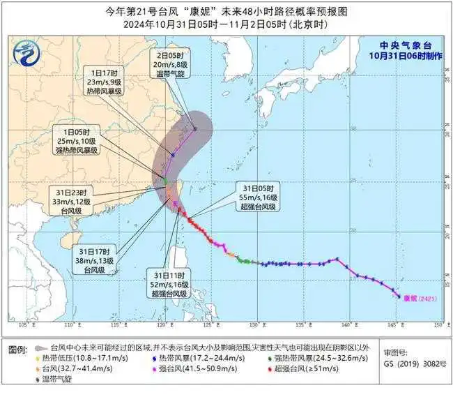 预计,“康妮”将于10月31日晚上进入台湾海峡,以后在闽浙近海逐渐转向东北方向移动,台湾岛、福建、浙江、上海和江苏南部等地将有强风雨天气。