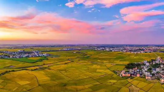 10月30日,广西南宁市宾阳县,火红的晚霞映照下,万亩香米生产示范区丰收的田园更加迷人。