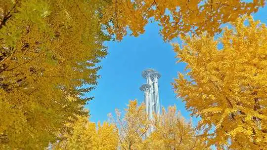 10月30日,北京天空湛蓝,银杏金黄,当奥林匹克塔与银杏同框,仿佛披上一件“金装”,在阳光的照耀下格外迷人。