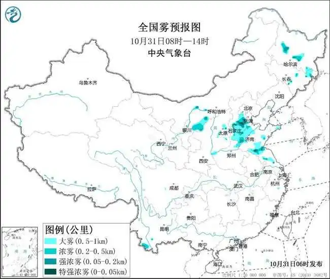 中央气象台10月31日06时继续发布大雾黄色预警。
