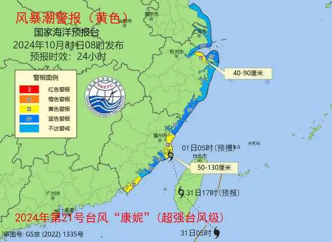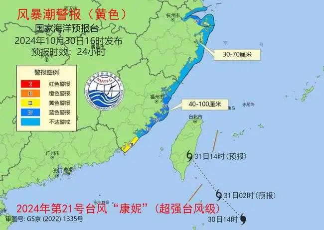 国家海洋预报台10月30日8时发布风暴潮蓝色警报:受今年第21号台风“康妮”(超强台风级)和冷空气的共同影响,预计10月30日下午至31日上午,福建沿海将出现40到90厘米的风暴增水。