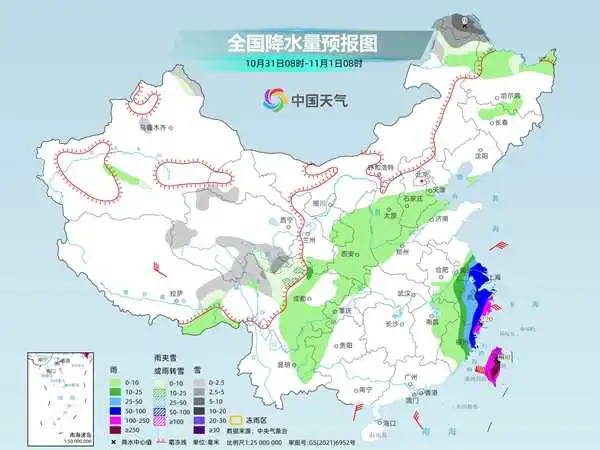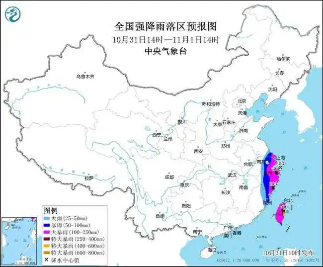 中央气象台10月31日06时发布暴雨蓝色预警。