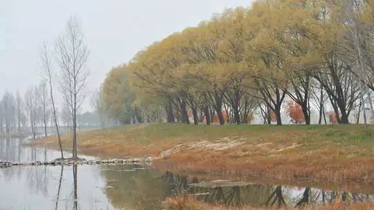 10月31日,北京野鸭湖湿地,大雾天气里,景色朦胧,天地仿佛蒙上了一层轻纱。