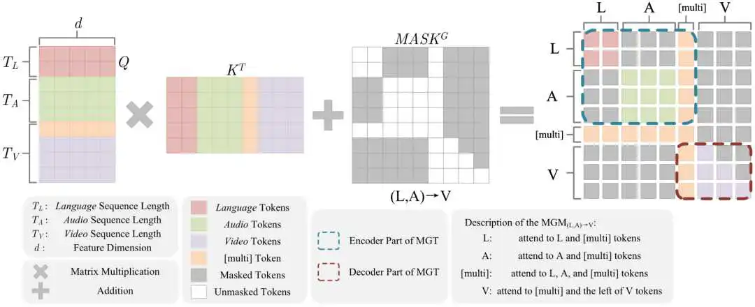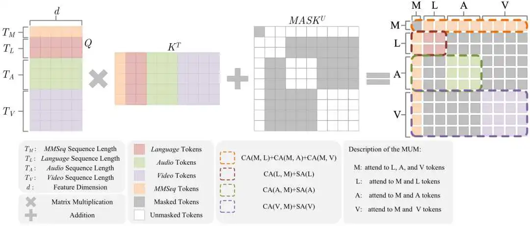 多模态理解Transformer主要由多模态理解掩码(Multimodal Understanding Mask,MUM)注意力机制组成。如图4所示,我们为注意力矩阵加上特定的掩码,从而使每个模态能够在一次注意力计算中同时完成模态内和模态间的交互。为了更好地得到多模态表征,我们还引入了一个随机初始化的序列MMSeq,用以汇聚所有模态的信息。