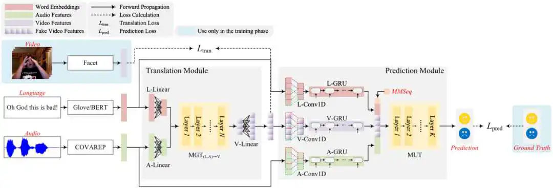 本文提出的UniMF整体框架如图1所示,主要包括翻译模块(Translation Module)和预测模块(Prediction Module)。以缺失视觉模态为例,在翻译模块中首先利用已有的语言、音频模态的信息,通过多模态生成Transformer(Multimodal Generation Transformer,MGT)解码出伪视觉模态,然后再在预测模块中通过多模态理解Transformer(Multimodal Understanding Transformer,MUT)将三者进行融合,得到情感分析结果。