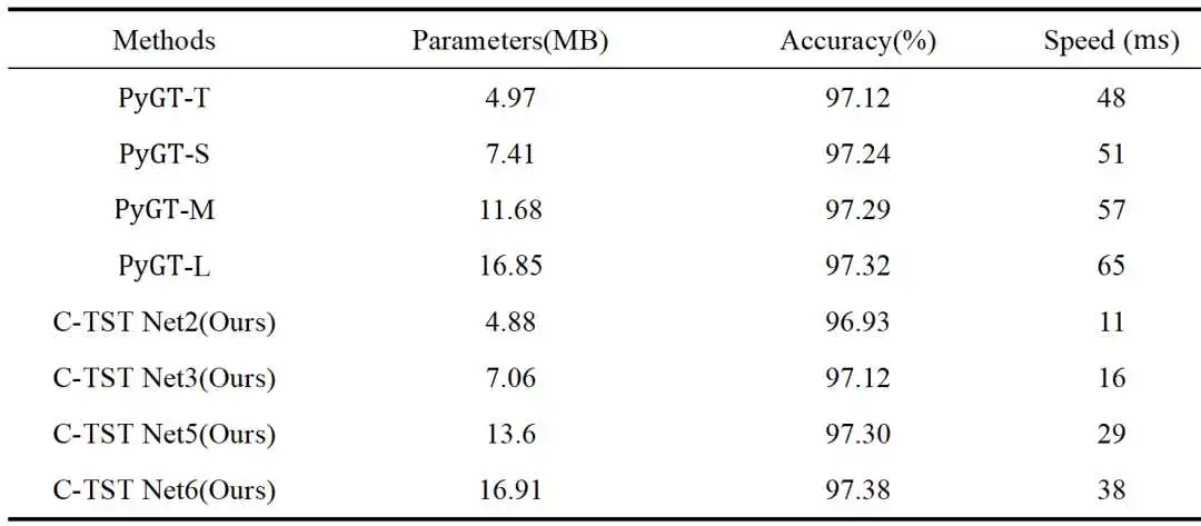 PyGT在OLHCCR领域中被认为是表现最优秀的模型。因此,本研究提出的C-TST模型与PyGT进行了对比,以评估C-TST的性能优势。比较结果如表2所示。当参数较少时,C-TST比PyGT具有更高的识别速度,而当参数较多时,C-TST比PyGT具有更高的识别速度和更高的准确率。