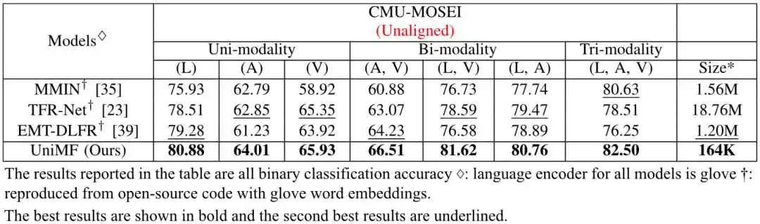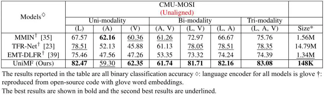 如表1和表2所示,本文所提出的方法UniMF在CMU-MOSI和CMU-MOSEI未对齐的数据集上均能以较少的参数量在各种模态缺失的情形下展现出优异的性能。