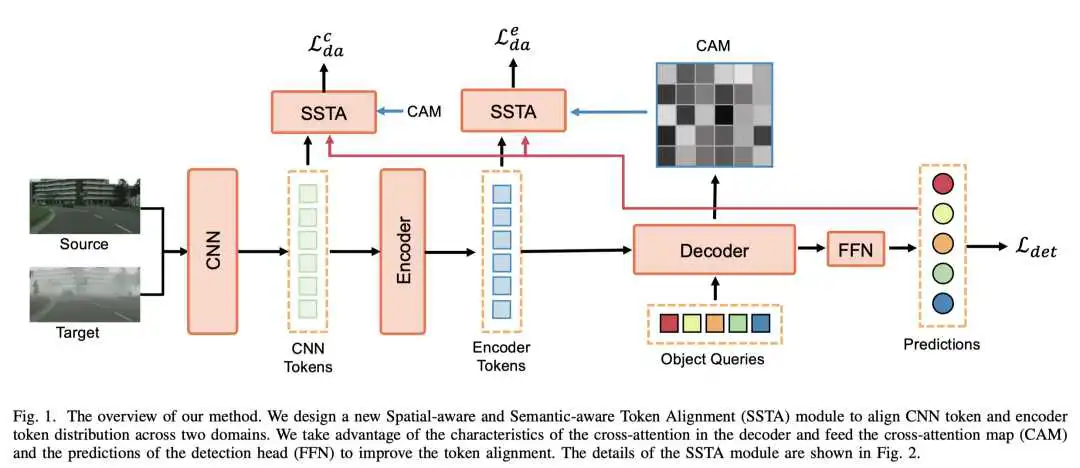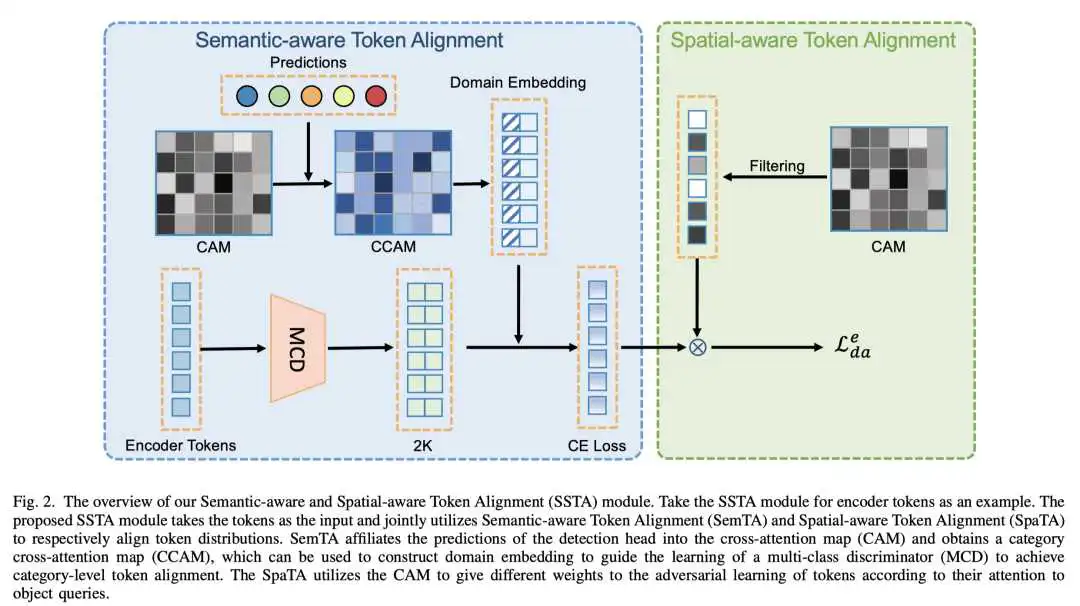 整体架构如图1所示,我们利用 DETR 中使用的交叉注意 (Cross-attention) 特性,新开发了两种策略,即空间感知词元对齐和语义感知词元对齐来指导特征的跨领域对齐。在DETR中,解码器的交叉注意力机制计算 Object Query到编码器输出的交叉注意力从而中聚合信息用于最终的分类和回归预测。在此过程中,为了准确检测目标,只需要注意图像词元其中的一小部分。对于空间感知的词元对齐(图2右),我们可以从交叉注意力图(cross-attention map, CAM)中提取信息,根据每一个词元和 Object Query 的注意力大小来调整分布对齐的强度。对于语义感知的词元对齐(图2左),我们将类别信息注入到交叉注意图中并构建领域嵌入来指导多类领域鉴别器的学习,从而在整个适应过程中建模类别关系并实现类别级对齐。