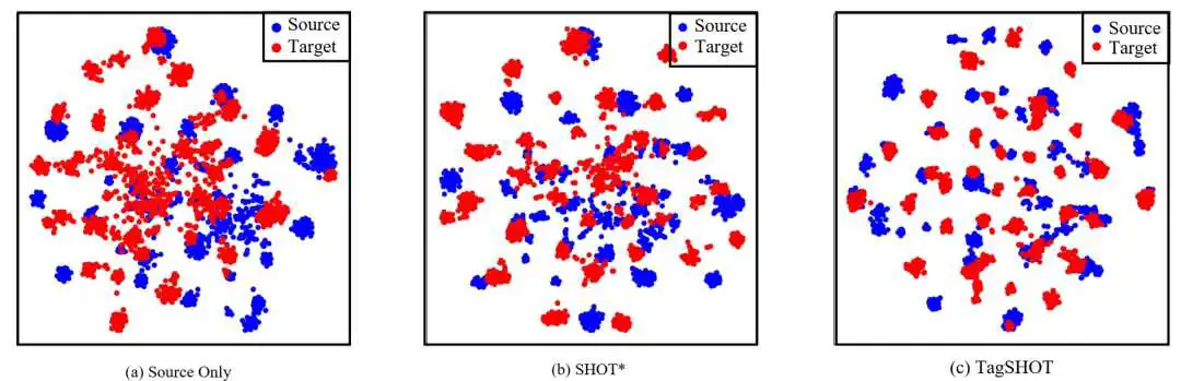 为了验证所提方法TagSHOT的性能,本文基于两种Transformer模型,即ViT-S、ViT-B,在三种不同规模的数据集Office-31、Office-Home和VisDA-C上分别进行了实验。实验结果如表1-3所示,TagSHOT在所有数据集上的表现均优于现有方法。此外,以Office-Home中Art域迁移到Product域验证场景为例,图3展示了源域特征和目标域特征t-SNE可视化,其中Source Only为没有进行学习的源模型,SHOT为同时期最优模型。从实验结果可以看出,所提方法TagSHOT可以实现更好的特征对齐,显著提升了模型迁移的效果。