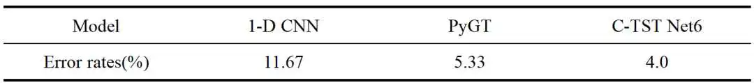 为了验证C-TST在识别非标准字符方面的性能,我们将其与1-D CNN和PyGT进行了对比。具体而言,我们从ICDAR-2013数据集中随机选取了300个非标准字符样本作为测试集。在表1中,展示了1-D CNN、PyGT-L和C-TST在这个测试集上的错误率。结果显示,1-D CNN的错误率显著高于C-TST和PyGT-L,而C-TST的错误率略低于PyGT-L。