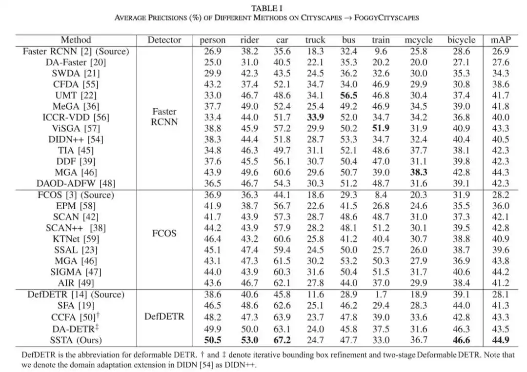 本论文提出的方法在多个场景中进行验证,包括晴天到雾天、合成到真实、不同场景差异、相机视角差异等。实验的结果表明(如表1所示,其为晴天到雾天的 Cityscapes to Foggy Cityscapes结果),我们的方法相比于未迁移的模型(Source)提升了16.8% mAP,极大地提升了模型在目标域上的检测性能,验证了DETR检测器的跨域检测能力。此外,相比以前的跨域目标检测方法也具有较大的提升,证明了所提方法的有效性。Transformer作为当前先进的深度学习模型架构,具有统一多模态输入的能力,本论文对 DETR 目标检测器的可迁移性的探索,可为未来多模态大模型的可迁移性提供支撑。