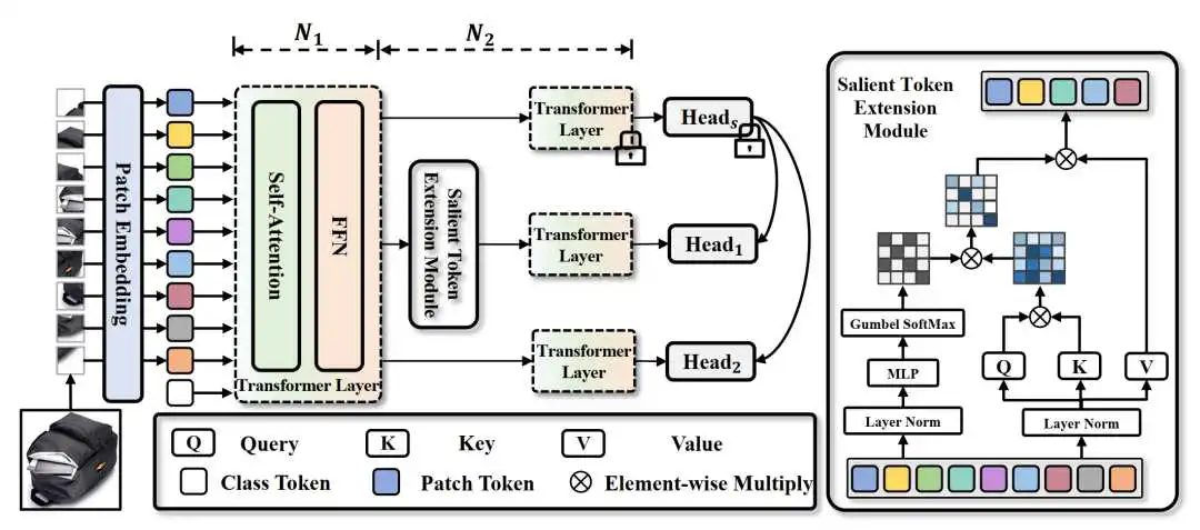 本文提出的模型框架如图1所示。首先,本文深入研究了跨不同Transformer层的分类表示元之间的相关性,揭示了预训练源模型中隐藏的识别相关权重,并构建了完备源分类假说空间。如图2所示,可以观察到前11层的分类表示元之间存在高度相关性,而其他表示元随着网络加深相关性不断增加。这一观察结果表明,最后一层的参数在汇聚分类表示元内分类所需的信息方面发挥着重要作用。因此,本文尝试固定更多的源域权重来构建完备的源分类空间。通过将目标域特征对齐到这个全面的分类空间,本文的模型促进了更广泛的与识别相关的知识迁移到目标域。此外,本文引入了一个显著表示元扩展模块,通过在表示元之间传播显着信息来捕获目标域特定的辨别线索,这一机制丰富了模型理解和整合目标特定细微差别的能力。具体地,该模块通过动态识别最为显著的嵌入特征,并有选择地抑制这些特征的更新,从而促进其他未被充分利用的嵌入特征得到进一步的学习和优化,提取更多目标域数据内在语义信息。