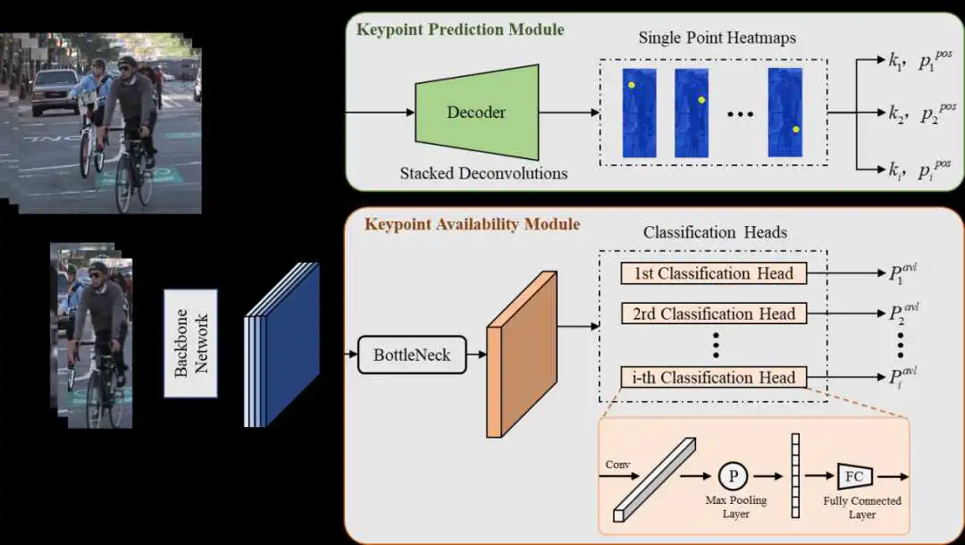 多人姿态跟踪是计算机视觉中被广泛研究的问题,在人体行为理解和场景分析领域中具有广泛的应用场景,如人机交互、视频监控、动作识别、体育视频分析等。尽管现有的基于自顶向下框架的多人姿态跟踪方法已经取得了一定的成果,但是仍然存在以下问题:一方面,关节点识别的准确性直接影响着多人姿态跟踪性能,而现有方法仅关注于关节点位置识别准确性的研究,却忽略了对关节点可用性识别的探索。该类方法仅使用关节点位置概率为依据,通过阈值卡控进行不可用关节点过滤,在遮挡以及帧模糊情况下容易产生关节点错检测和漏检测。另一方面,现有方法的跟踪方式过于依赖行人检测的结果。该类方法在行人检测基础上进行帧间匹配,当行人检测出现漏检时,容易导致跟踪轨迹断裂或抖动。此外,这种基于检测的跟踪方式无法重新识别曾丢失视野的行人轨迹。