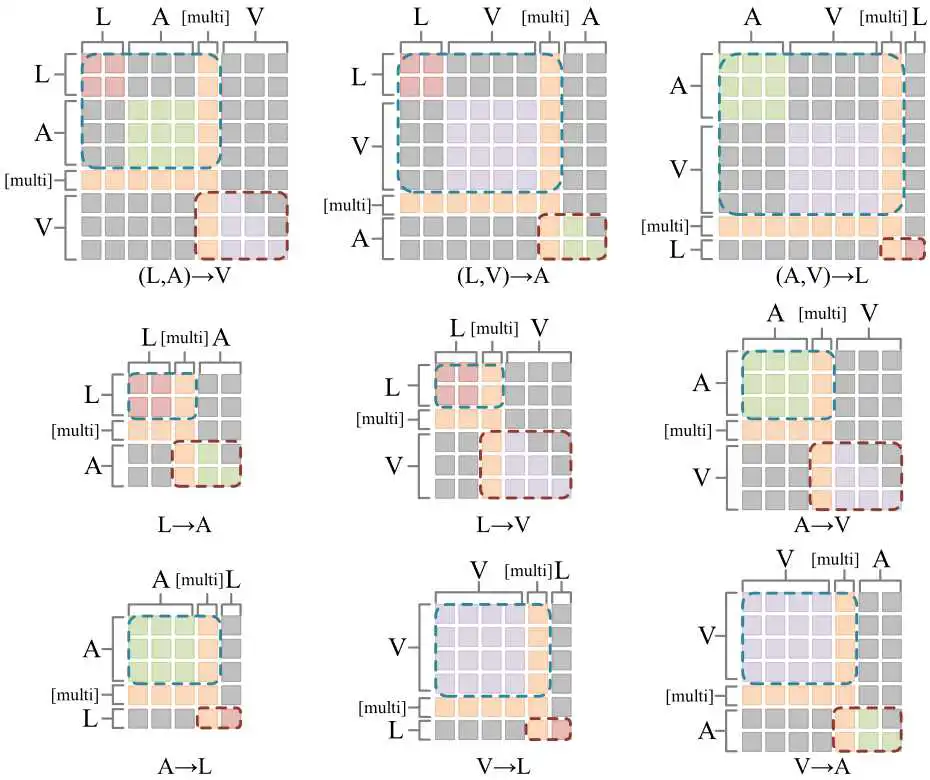 多模态生成Transformer主要由多模态生成掩码(Multimodal Generation Mask,MGM)注意力机制组成。如图2所示,同样以缺失视觉模态为例,我们为注意力矩阵加上模态翻译方向特定的掩码矩阵,从而使得已有模态的编码和缺失模态的解码可以在一次注意力计算中完成。此外,我们还引入了随机初始化的[multi]字符,以充当编码和解码之间的桥梁,它既编码了已有模态的信息,又充当着解码缺失模态时的起始符。总而言之,对于不同的模态缺失情形,我们共设计了9类MGM,如图3所示。