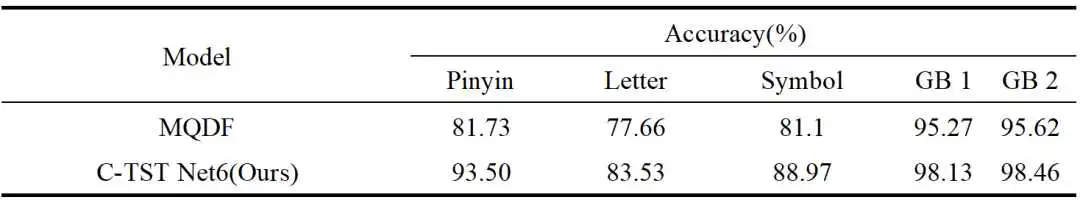 为了证实C-TST模型的鲁棒性,本文在SCUT-COUCH2009数据集的五个子集上进行了实验。在表3中,我们展示了C-TST在SCUT-COUCH2009各个子集上的识别准确率。与MQDF模型相比,实验结果显示了C-TST在整个SCUT-COUCH2009数据集上的优越性能,特别是在处理Pinyin和Letter这两个子集时的显著优势。