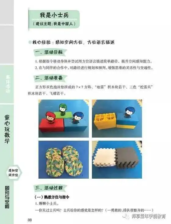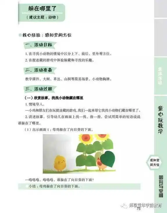 在小班活动中,有“我和垫子做游戏”和“躲在哪里了”。“我和垫子做游戏”活动的核心经验是数量比较感知空间方位。利用小垫子可以玩的游戏真多呢!垫子可以玩骑小马游戏,还可以玩跳泥坑游戏。在游戏的过程中,孩子可以数数,也可以感受空间方位。“躲在哪里了”活动的核心经验是感知空间方位。在故事的引导下,让孩子说说:小动物躲在哪里?是树下?还是花后面?