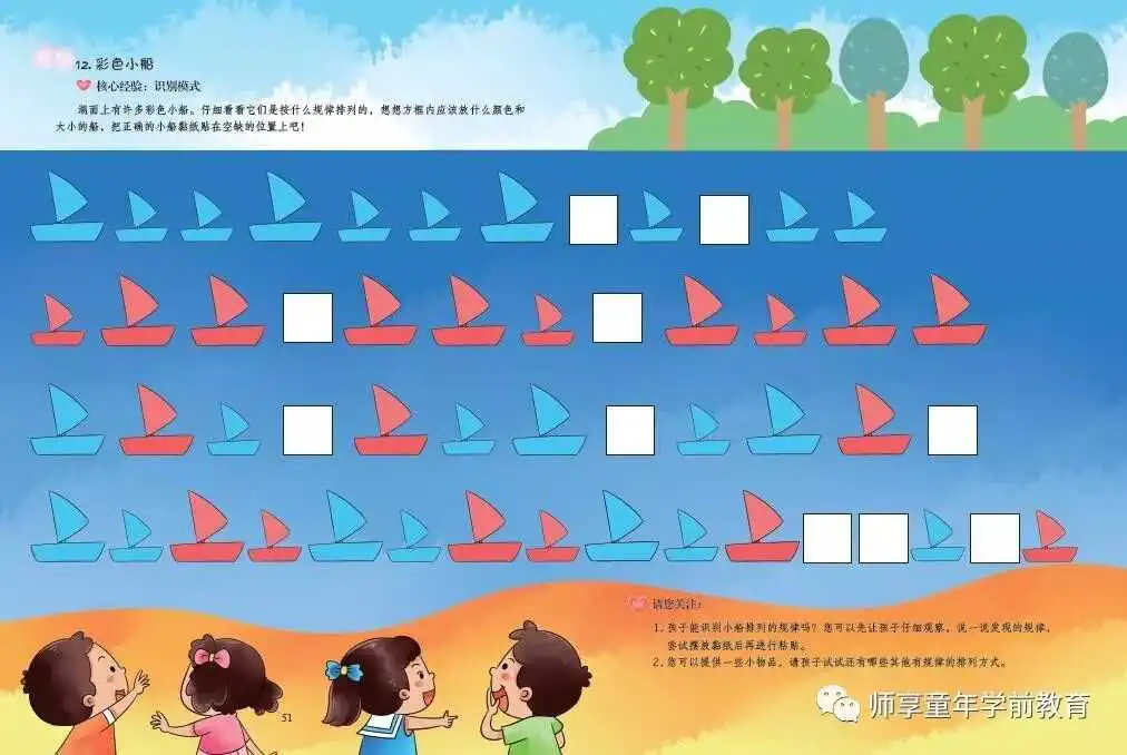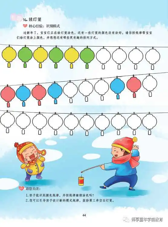 小班孩子可以玩哪些有意思的、和数学相关的活动呢?在集合与模式板块,教师用书中有“挂灯笼”亲子游戏指导;在幼儿操作材料中,孩子可以根据排列模式,补充完剩余的灯笼,巩固模式规律。