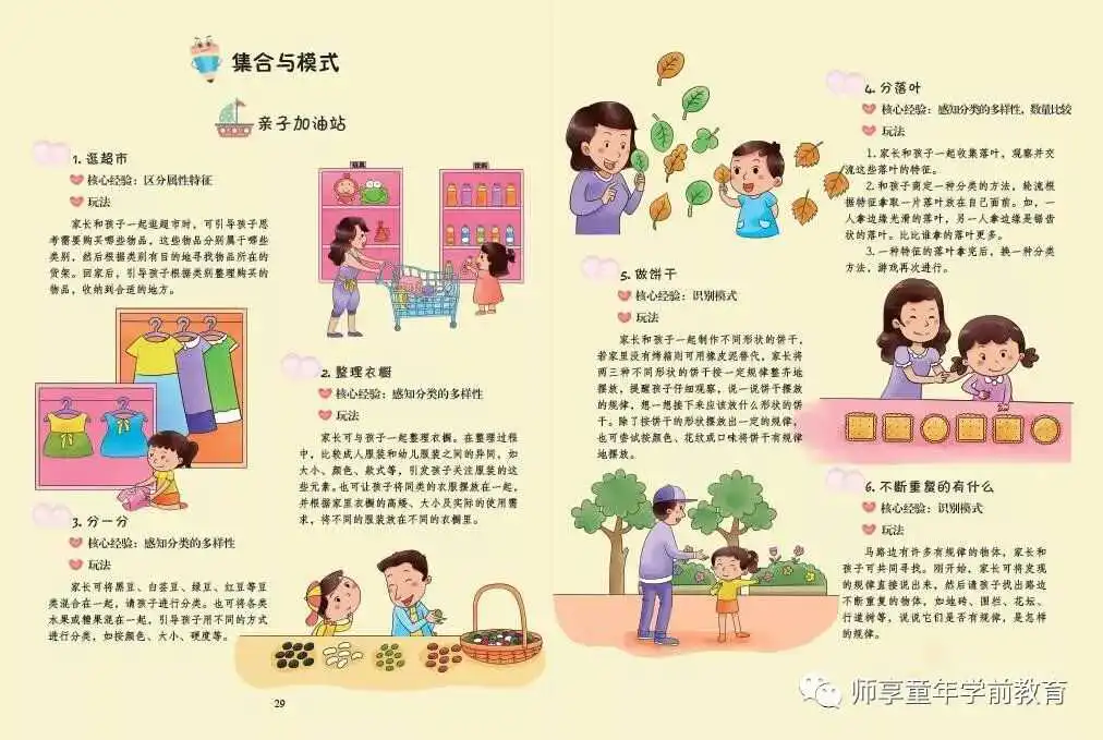 幼儿操作材料同样按照四个板块的数学核心经验来编排,每个数学核心板块下有亲子加油站和活动,亲子加油站中有数十个亲子游戏,还有活动操作页,每个活动后都配有“请您关注”的温馨提示,告诉家长关注点有哪些。