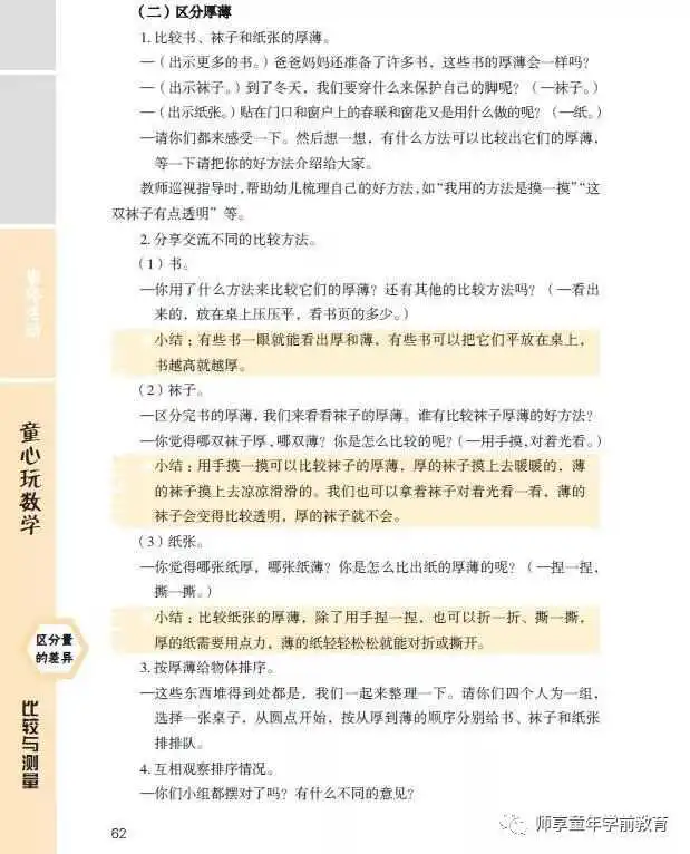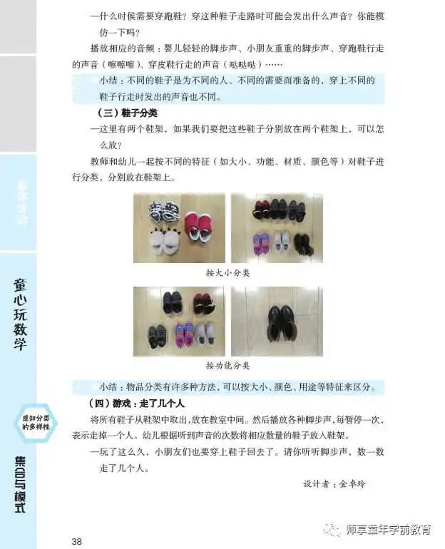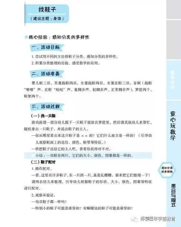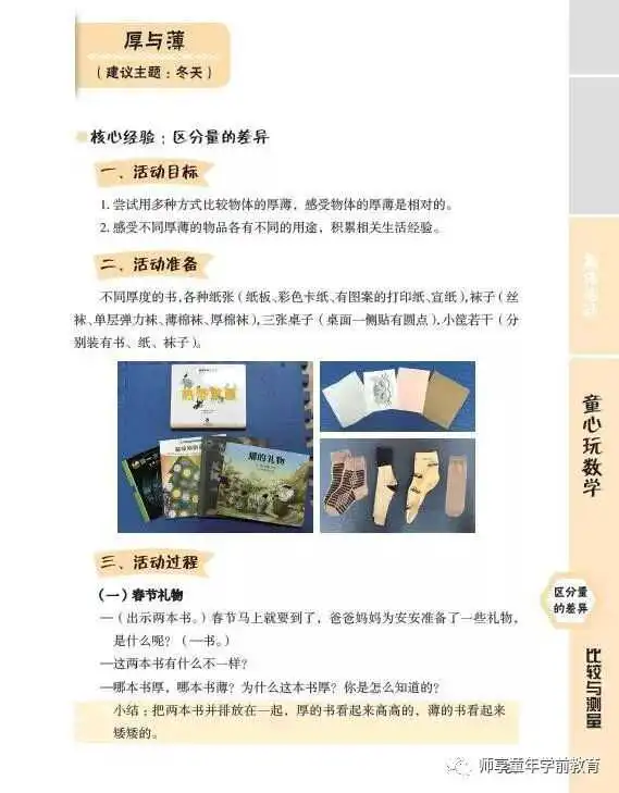 在中班活动中,有“找鞋子”与“厚与薄”。“找鞋子”活动的核心经验是感知分类的多样性、区分量的差异。当孩子看到家中大小不一的鞋子时,会想到将鞋子进行分类,可以用不同的分类方法进行分类。“厚与薄”活动的核心经验是区分量的差异,体验厚与薄是相对的。