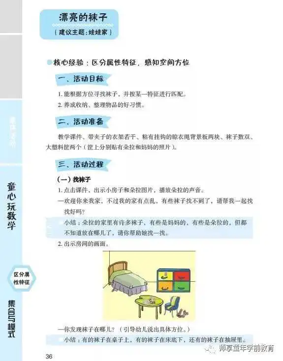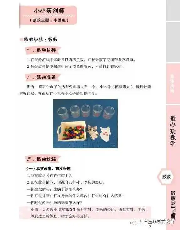 在小班活动中,有“小小药剂师”和“漂亮的袜子”。“小小药剂师”这个活动来源于孩子生活中的经验。孩子都有生病吃药的生活经验,如何按照要求将药片放到药瓶中,在这个过程中可以锻炼孩子数数的能力。“漂亮的袜子”这个活动核心经验是:区分属性特征,感知空间方位,源于孩子对整理物品比较喜欢。